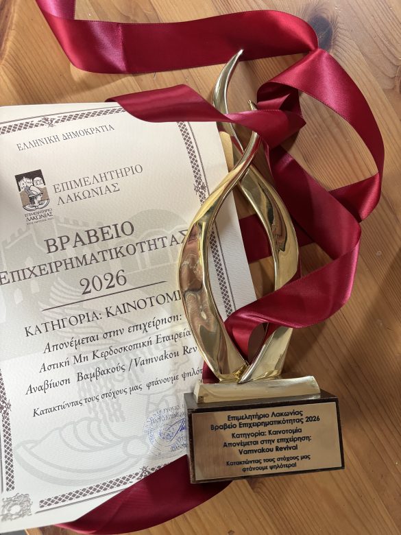 With great joy and honor, we announce that Vamvakou Revival was recognized in the “Innovation” category at the 2026 Entrepreneurship Awards organized by the Laconia Chamber of Commerce. The event took place on Saturday, February 14, 2026, in Gytheio.