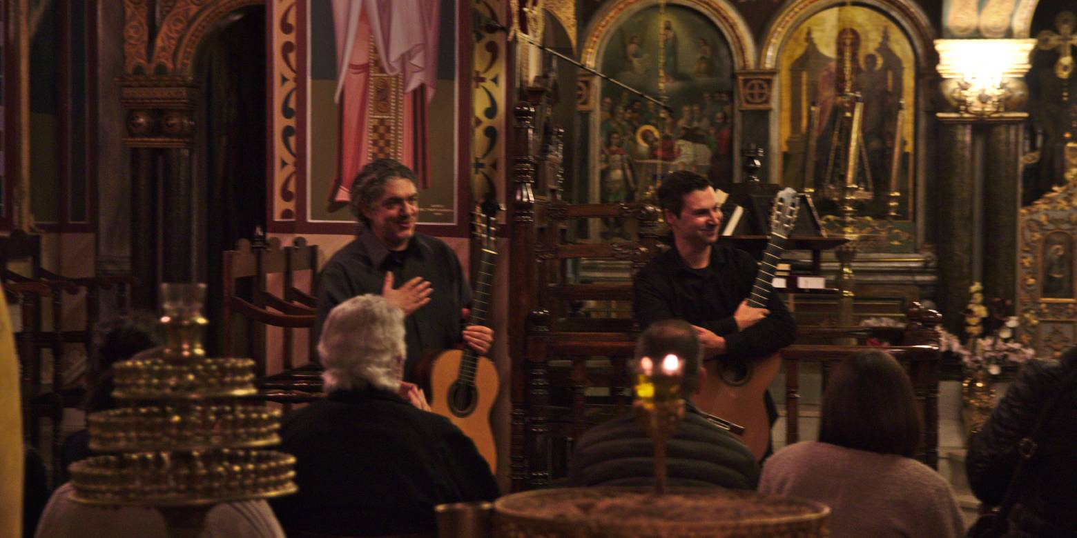 Κατανυκτική ατμόσφαιρα σε μια ιδιαίτερη μουσική βραδιά! Έχετε ακούσει πολλές φορές να δίνονται ρεσιτάλ μουσικής μέσα στην εκκλησία ενός χωριού; Κάποιοι θα έλεγαν πως αποκλείεται. Κι όμως, στη Βαμβακού, ένα μοναδικό μελωδικό ταξίδι στην κλασική – και όχι μόνο – μουσική με δύο κιθάρες, θα λάβει χώρα για πρώτη φορά στον εσωτερικό χώρο της κεντρικής εκκλησίας του χωριού, τον Ιερό Ναό Αγίου Χαραλάμπους, το Σάββατο 21 Δεκεμβρίου, στις 19:00, από τους D&A GuitarDuo, Δημήτρη Κουρζάκη και Άγγελο Μπότση. Πρόκειται για ένα ντουέτο κιθάρας που έχει καθιερωθεί ως ένα από τα σημαντικά στην Ελλάδα, έχοντας αποσπάσει εξαιρετικές κριτικές σε εμφανίσεις τους σε μεγάλες αίθουσες συναυλιών και διεθνή φεστιβάλ κιθάρας. Το μουσικό πρόγραμμα περιλαμβάνει κομμάτια κλασικής μουσικής από μονόπρακτα μπαλέτου, όπερα, πρωτότυπες διασκευές για δύο κιθάρες, αλλά και μία απρόβλεπτη διασκευή, με την οποία θα πέσει η αυλαία της εκδήλωσης.